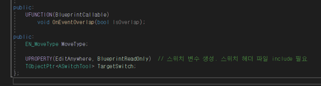 이후, 바인딩할 클래스의 헤더에서 Switch 변수와 바인딩할 함수를 생성한다.