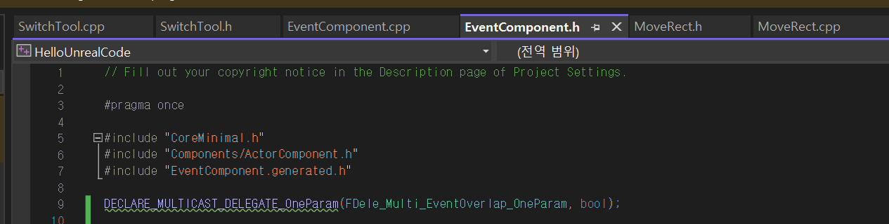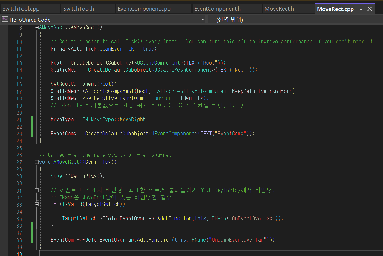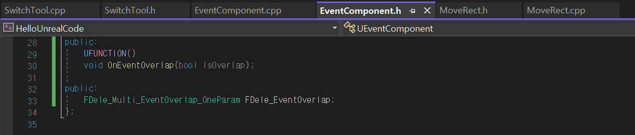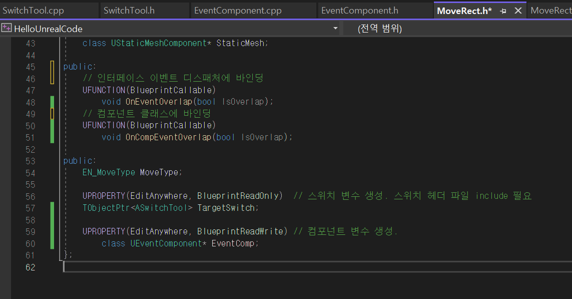 이후, MoveRect 헤더파일에서 컴포넌트 클래스의 이벤트 디스패처에 바인딩하기 위한 변수와 함수를 생성한다.