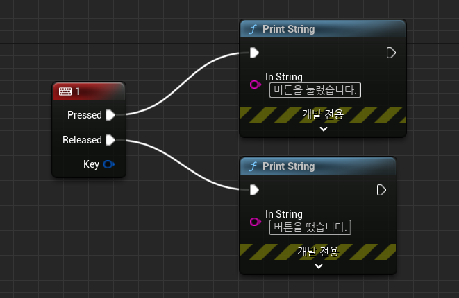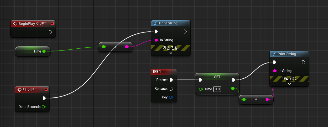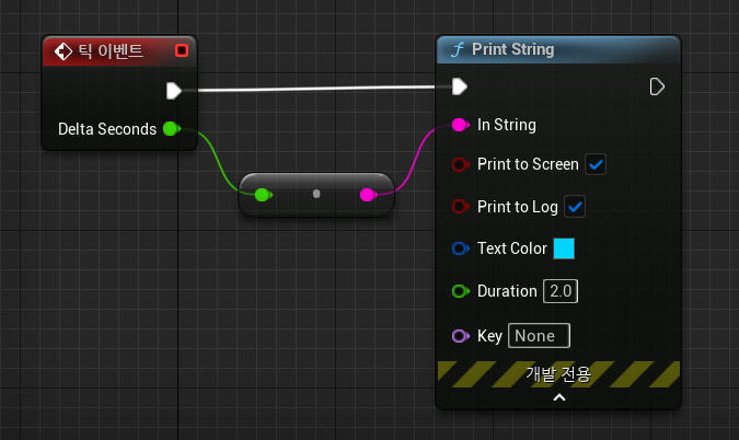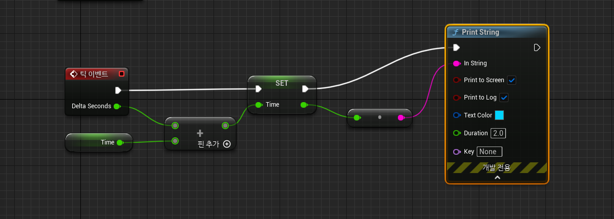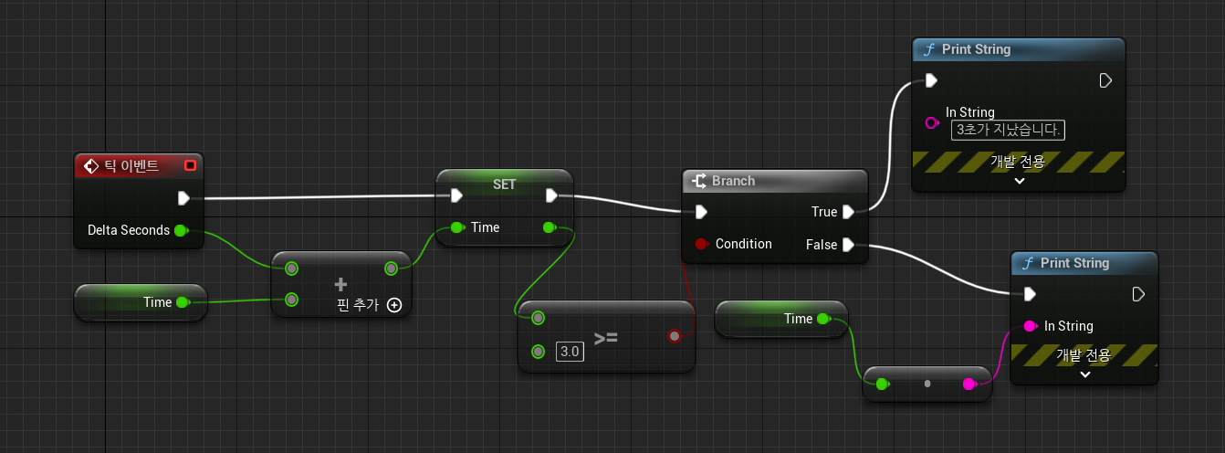 프레임마다 매 초를 출력하는데, 3초가 지나면 “3초가 지났습니다.” 메시지를 출력한다. 비교연산자의 Condition값에 아무런 연결이 되어있지 않을 경우, 기본값이 true로 체크되어 있으므로 true값을 출력한다.